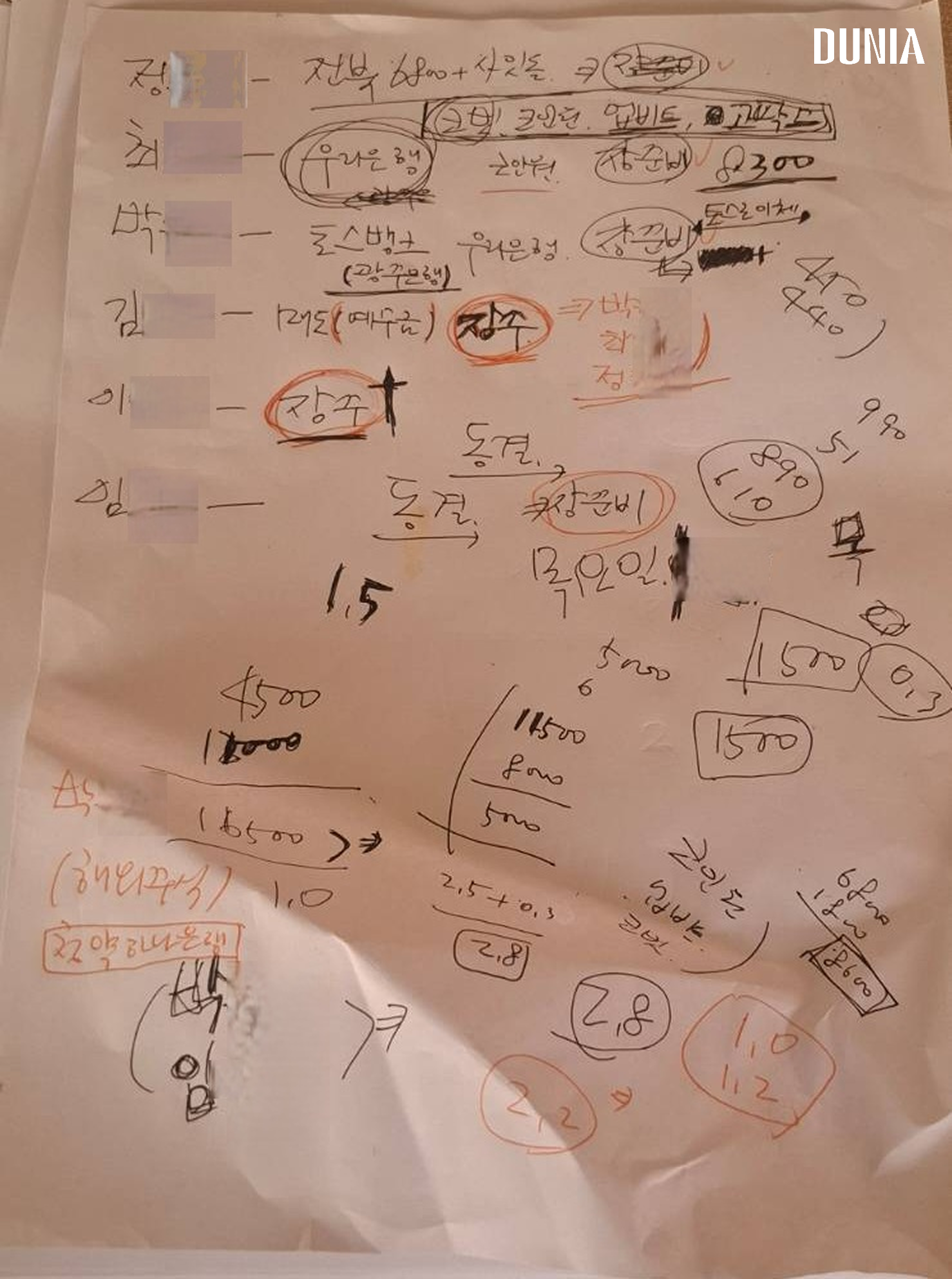 In another internal document obtained by Dunia, the names of a person known as 'Jonber Kim' (Mr. Park), a figure involved in cryptocurrency fraud cases, and his accomplice Mr. Choi, were found. The document contains a handwritten memo with the names of six individuals presumed to be fund managers, along with information on banks and coin trading platforms, mixed with slang such as "Jang-ju" (account holder), "Jang-junbi" (account preparation), and "Dong-gyeol" (frozen).